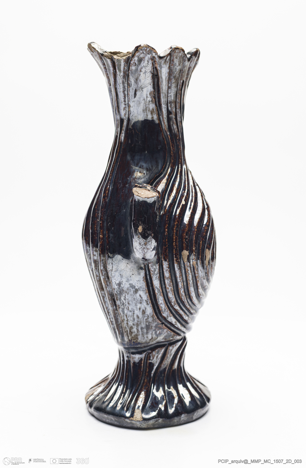 Matéria/Técnica: Barro vermelho moldado. Vidrado castanho escuro; Cronologia: 1862; Autoria: Manuel Cipriano Gomes Mafra / Caldas da Rainha; Dimensões (cm): Altura: 21; Largura: 8; Comprimento: 9,5.