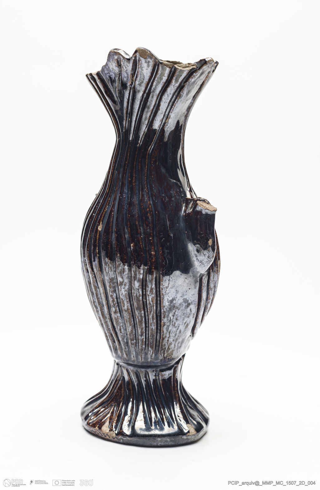 Matéria/Técnica: Barro vermelho moldado. Vidrado castanho escuro; Cronologia: 1862; Autoria: Manuel Cipriano Gomes Mafra / Caldas da Rainha; Dimensões (cm): Altura: 21; Largura: 8; Comprimento: 9,5.