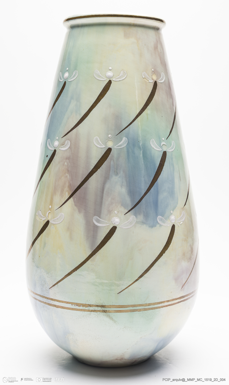 Matéria/Técnica: Faiança moldada. Vidrado polícromo: branco, azul, rosa e castanho; Cronologia: 1903; Autoria: Rafael Bordalo Pinheiro / Fábrica De Faianças Bordalo Pinheiro, Caldas da Rainha, Portugal; Dimensões (cm): Altura: 31; Diâmetro: 17.