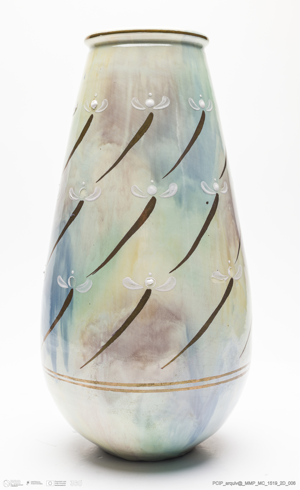 Matéria/Técnica: Faiança moldada. Vidrado polícromo: branco, azul, rosa e castanho; Cronologia: 1903; Autoria: Rafael Bordalo Pinheiro / Fábrica De Faianças Bordalo Pinheiro, Caldas da Rainha, Portugal; Dimensões (cm): Altura: 31; Diâmetro: 17.