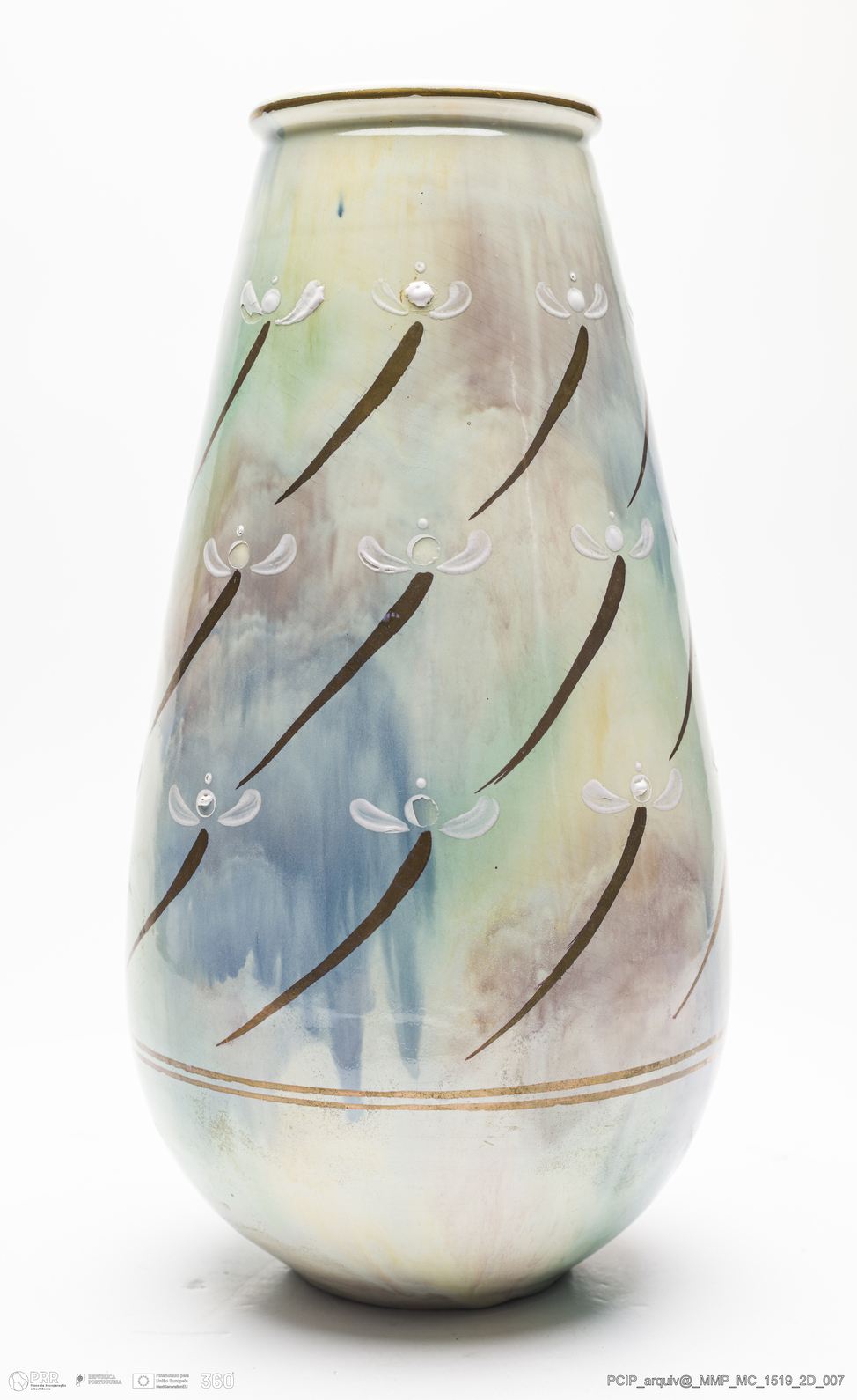 Matéria/Técnica: Faiança moldada. Vidrado polícromo: branco, azul, rosa e castanho; Cronologia: 1903; Autoria: Rafael Bordalo Pinheiro / Fábrica De Faianças Bordalo Pinheiro, Caldas da Rainha, Portugal; Dimensões (cm): Altura: 31; Diâmetro: 17.