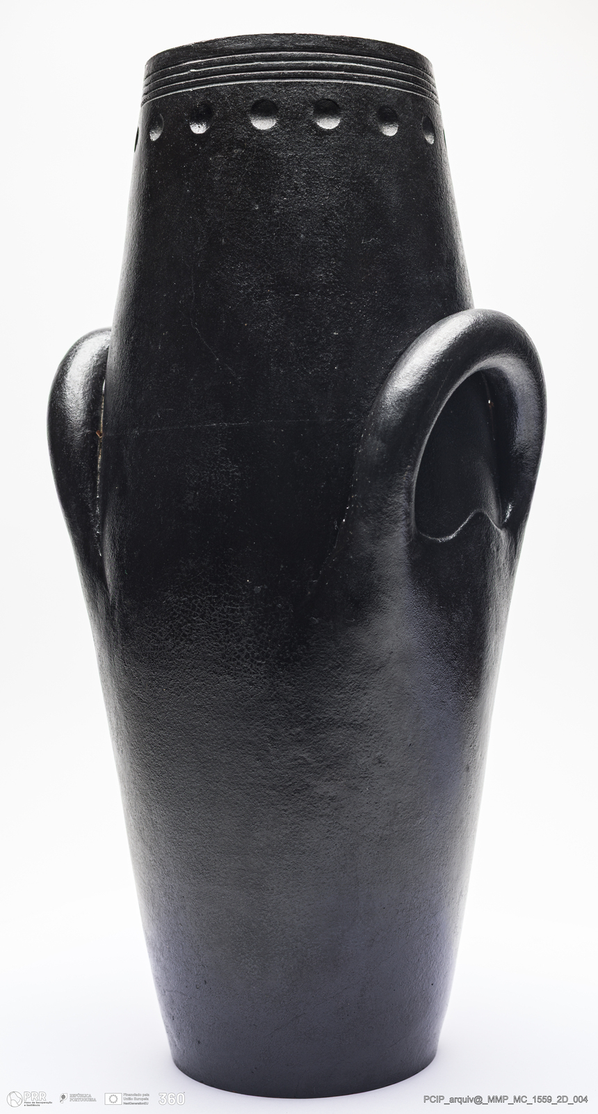 Matéria/Técnica: Barro vermelho moldado e modelado. Vidrado polícromo castanho de manganês mate no exterior e branco de estanho no interior; Cronologia: 1908-1916; Autoria: António Augusto da Costa Motta / Fábrica de Faianças das Caldas da Rainha, Portugal; Dimensões (cm): Altura: 45; Largura: 23.