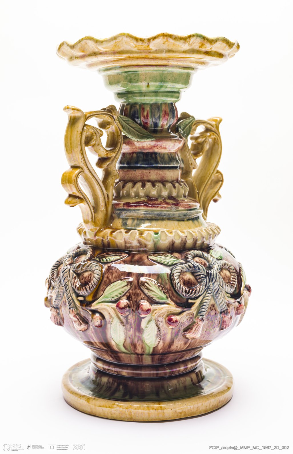 Matéria/Técnica: Barro vermelho moldado e modelado. Vidrado polícromo: castanho, creme, azul, amarelo e vermelho; Cronologia: 1870-1887; Autoria: Manuel Cipriano Gomes Mafra / Fábrica Manuel Cipriano Gomes O Mafra, Caldas da Rainha, Portugal; Dimensões (cm): Altura: 32,3; Largura: 19; Comprimento: 19,5.
