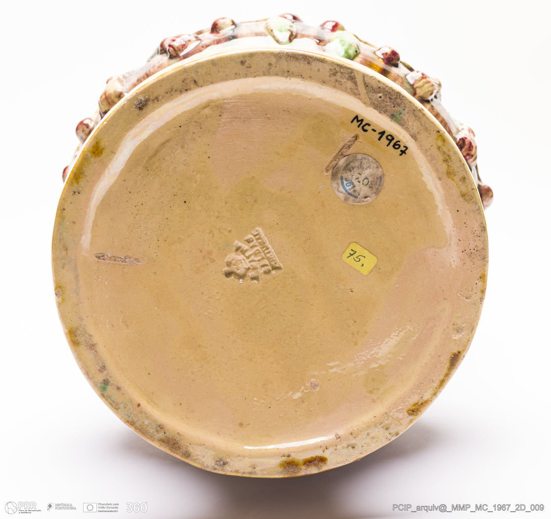 Matéria/Técnica: Barro vermelho moldado e modelado. Vidrado polícromo: castanho, creme, azul, amarelo e vermelho; Cronologia: 1870-1887; Autoria: Manuel Cipriano Gomes Mafra / Fábrica Manuel Cipriano Gomes O Mafra, Caldas da Rainha, Portugal; Dimensões (cm): Altura: 32,3; Largura: 19; Comprimento: 19,5.