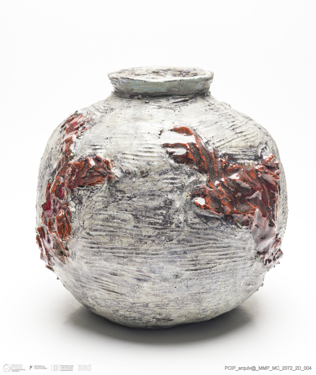 Matéria/Técnica: Barro vermelho modelado. Vidrado em tons de cinzento e vermelho; Cronologia: século XX; Autoria: Maria Luisa Fragoso / Estúdio Escola de Cerâmica, Lisboa, Portugal; Dimensões (cm): Altura: 19,5; Diâmetro: 20,5.