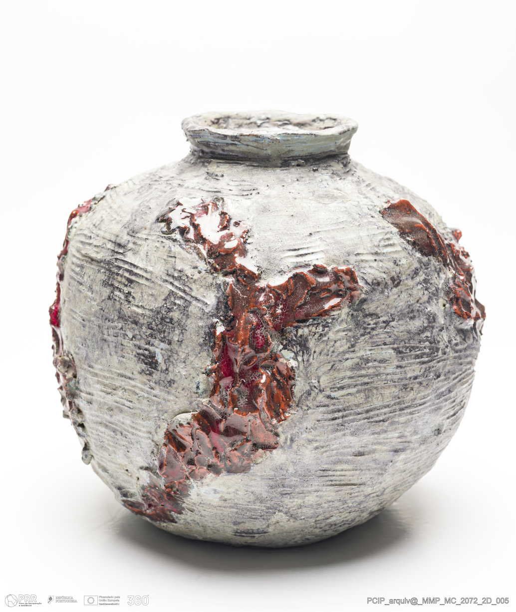 Matéria/Técnica: Barro vermelho modelado. Vidrado em tons de cinzento e vermelho; Cronologia: século XX; Autoria: Maria Luisa Fragoso / Estúdio Escola de Cerâmica, Lisboa, Portugal; Dimensões (cm): Altura: 19,5; Diâmetro: 20,5.