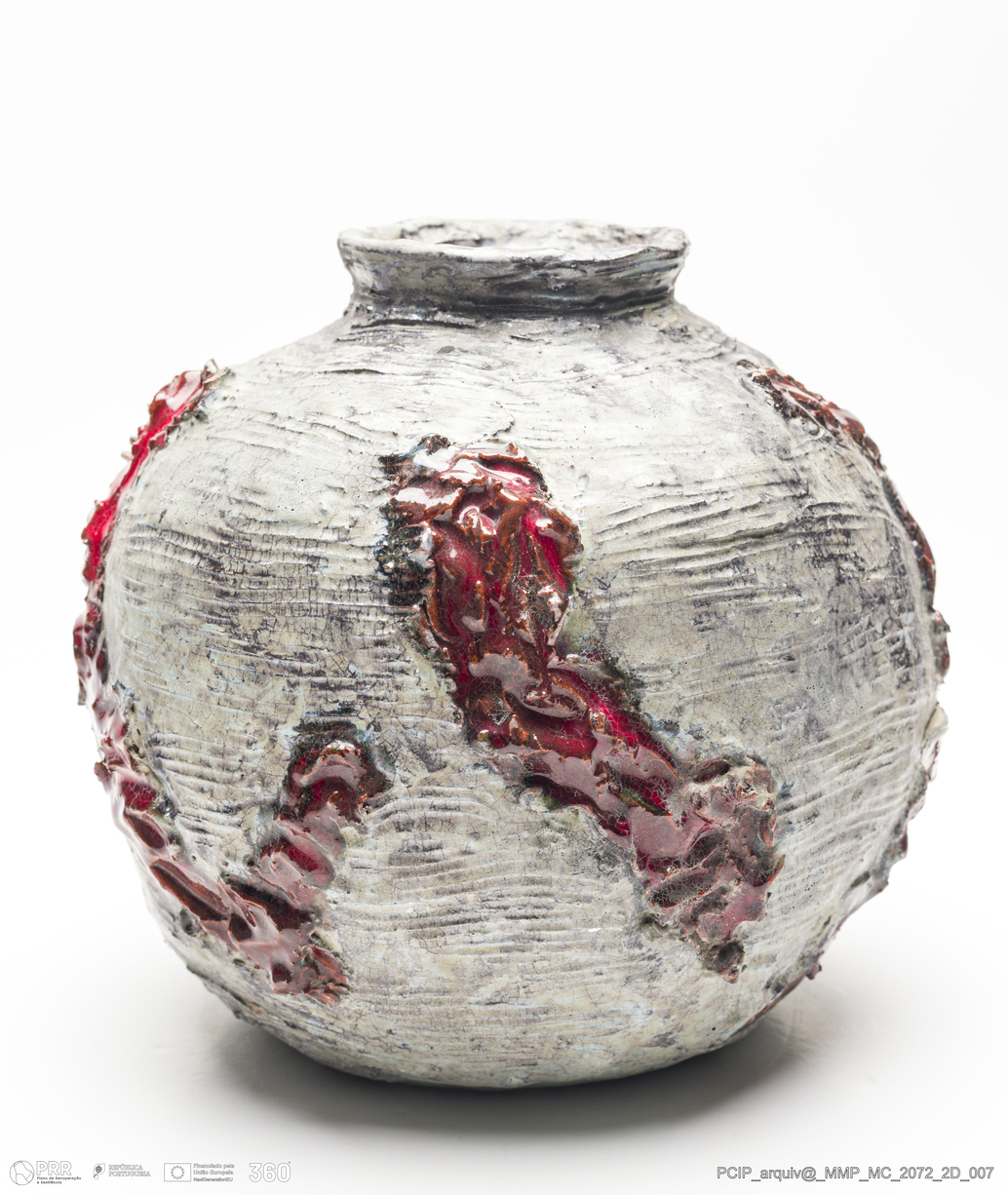 Matéria/Técnica: Barro vermelho modelado. Vidrado em tons de cinzento e vermelho; Cronologia: século XX; Autoria: Maria Luisa Fragoso / Estúdio Escola de Cerâmica, Lisboa, Portugal; Dimensões (cm): Altura: 19,5; Diâmetro: 20,5.
