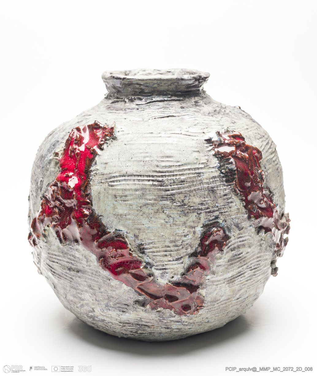 Matéria/Técnica: Barro vermelho modelado. Vidrado em tons de cinzento e vermelho; Cronologia: século XX; Autoria: Maria Luisa Fragoso / Estúdio Escola de Cerâmica, Lisboa, Portugal; Dimensões (cm): Altura: 19,5; Diâmetro: 20,5.