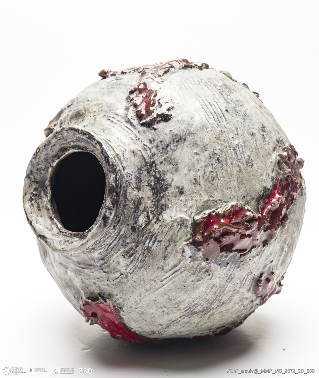 Matéria/Técnica: Barro vermelho modelado. Vidrado em tons de cinzento e vermelho; Cronologia: século XX; Autoria: Maria Luisa Fragoso / Estúdio Escola de Cerâmica, Lisboa, Portugal; Dimensões (cm): Altura: 19,5; Diâmetro: 20,5.