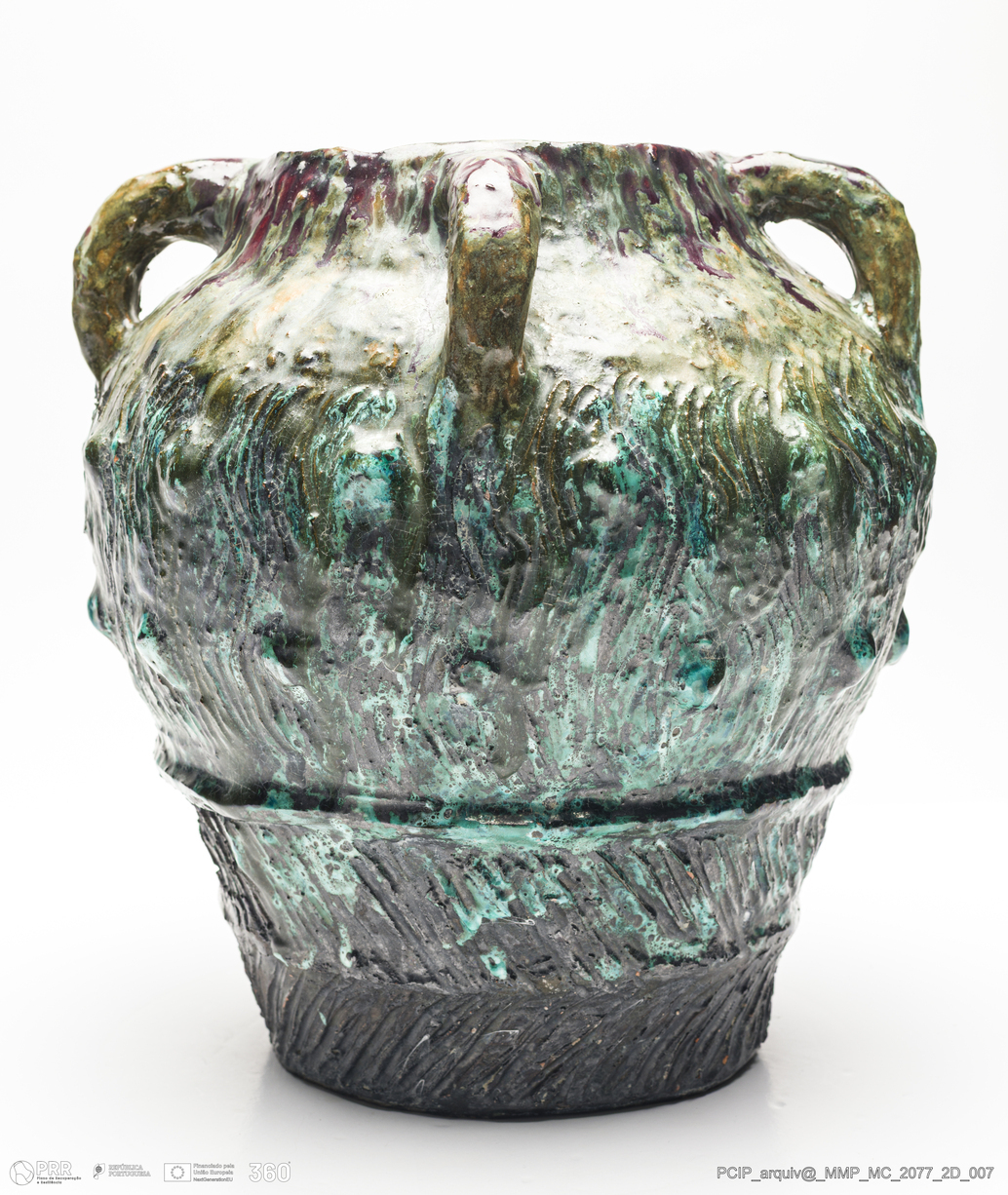 Matéria/Técnica: Barro vermelho modelado. Vidrado polícromo: preto, castanho, azul e verde; Cronologia: 1965; Autoria: Maria Luisa Fragoso / Estúdio Escola de Cerâmica, Lisboa, Portugal; Dimensões (cm): Altura: 29,5; Diâmetro: 28.