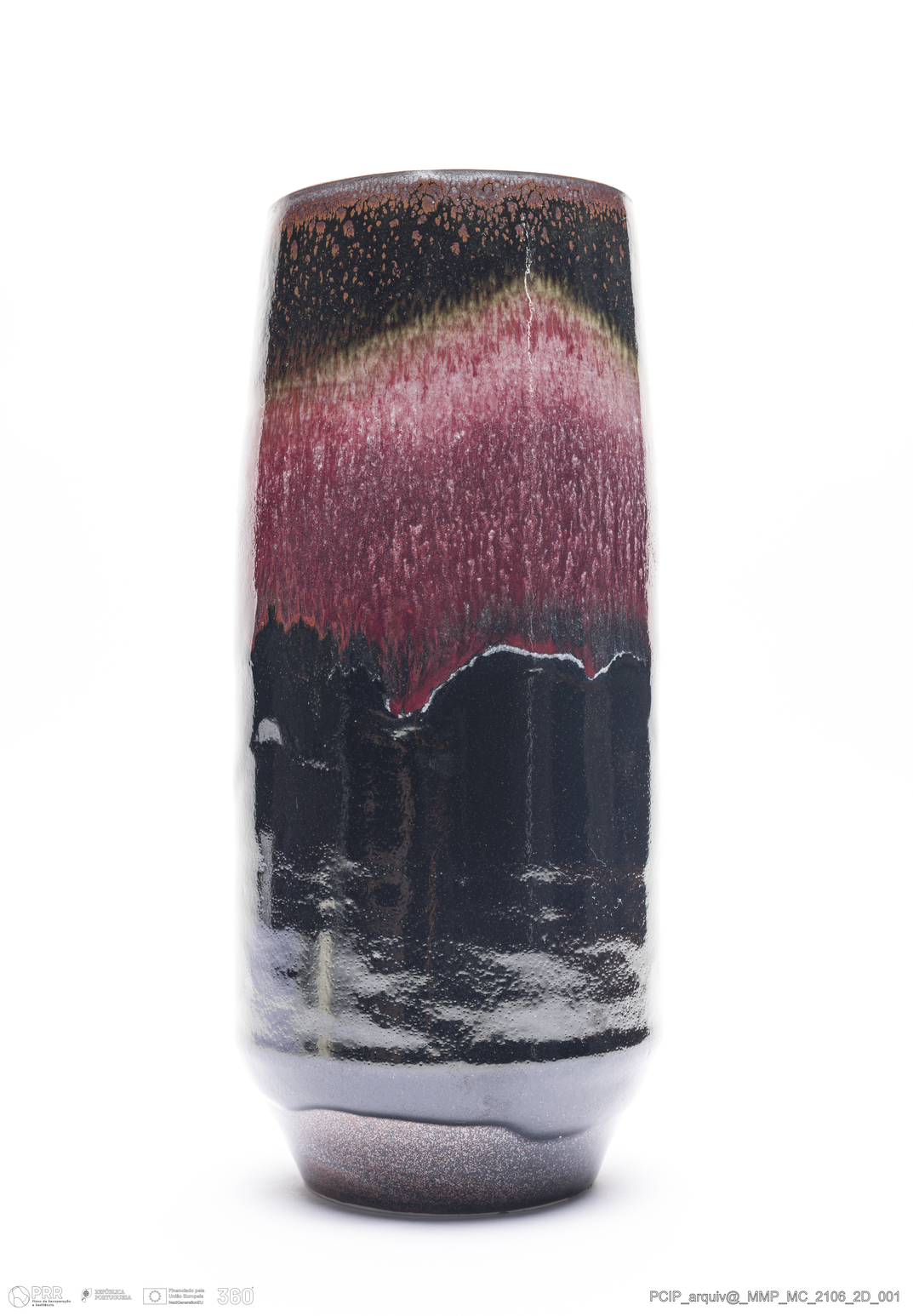 Matéria/Técnica: Grés rodado. Vidrado polícromo: preto e vermelho de cobre; Cronologia: 1990; Autoria: Eduardo Constantino / Atelier de Ceramique de Eduardo Constantino, Quimperlé/Bretanha, França; Dimensões (cm): Altura: 26; Diâmetro: 10.