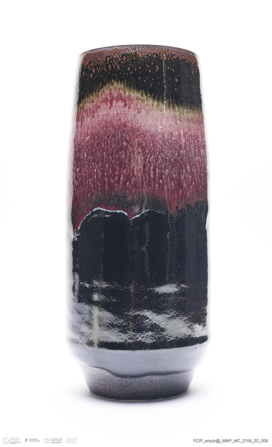 Matéria/Técnica: Grés rodado. Vidrado polícromo: preto e vermelho de cobre; Cronologia: 1990; Autoria: Eduardo Constantino / Atelier de Ceramique de Eduardo Constantino, Quimperlé/Bretanha, França; Dimensões (cm): Altura: 26; Diâmetro: 10.
