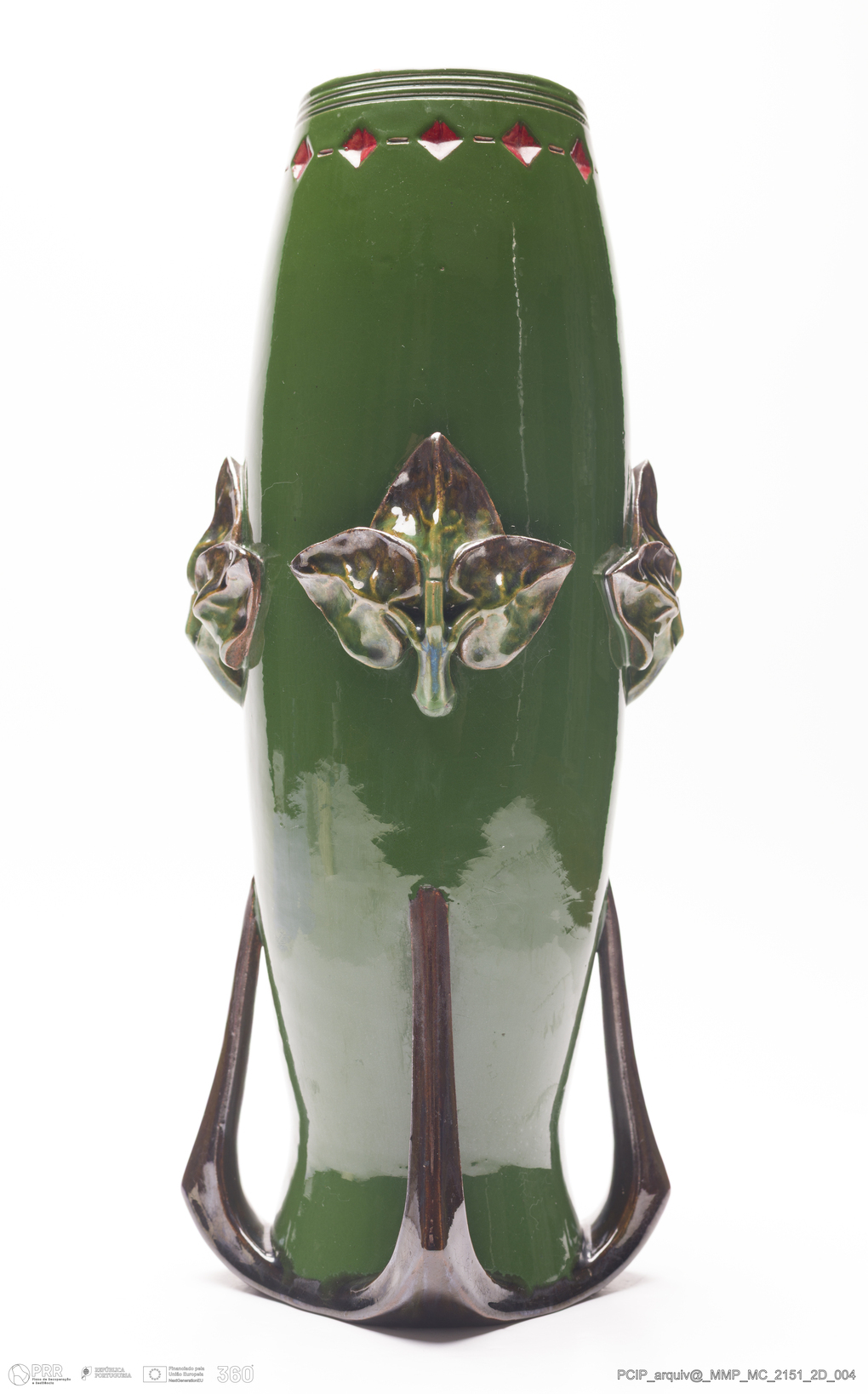 Matéria/Técnica: Barro vermelho moldado e modelado. Vidrado polícromo: verde cobre, castanho de manganês e vermelho; Cronologia: 1913; Autoria: António Augusto da Costa Motta / Fábrica de Faianças das Caldas da Rainha, Portugal; Dimensões (cm): Altura: 30; Diâmetro: 13.