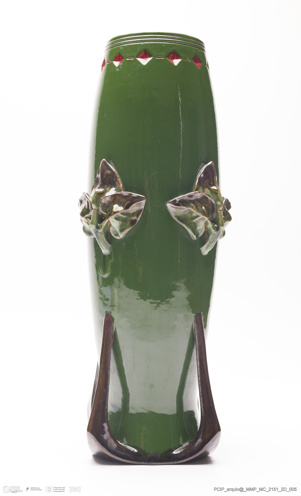 Matéria/Técnica: Barro vermelho moldado e modelado. Vidrado polícromo: verde cobre, castanho de manganês e vermelho; Cronologia: 1913; Autoria: António Augusto da Costa Motta / Fábrica de Faianças das Caldas da Rainha, Portugal; Dimensões (cm): Altura: 30; Diâmetro: 13.