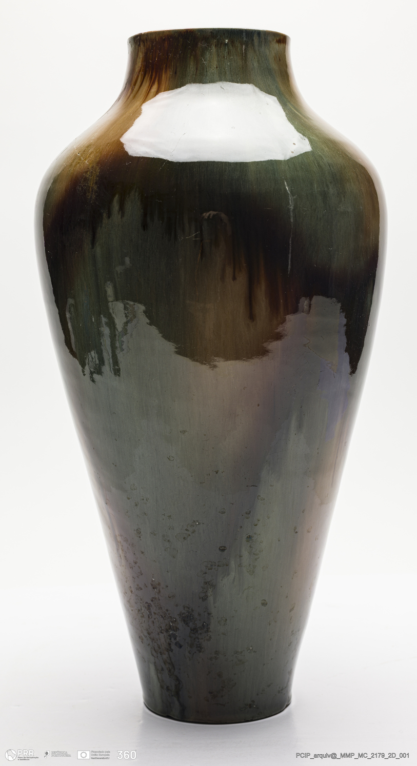 Matéria/Técnica: Barro moldado. Vidrado polícromo: vários tons de verde , castanho; Cronologia: 1885-1905; Autoria: Manuel Gustavo Bordalo Pinheiro / Fábrica Bordalo Pinheiro, Caldas da Rainha, Portugal; Dimensões (cm): Altura: 34; Diâmetro: 19.