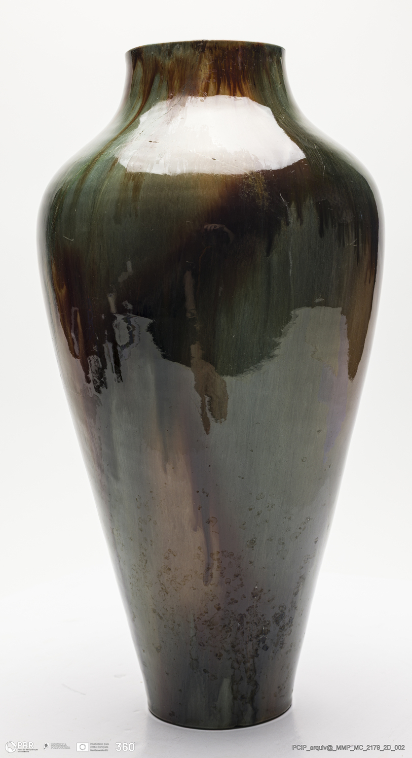 Matéria/Técnica: Barro moldado. Vidrado polícromo: vários tons de verde , castanho; Cronologia: 1885-1905; Autoria: Manuel Gustavo Bordalo Pinheiro / Fábrica Bordalo Pinheiro, Caldas da Rainha, Portugal; Dimensões (cm): Altura: 34; Diâmetro: 19.
