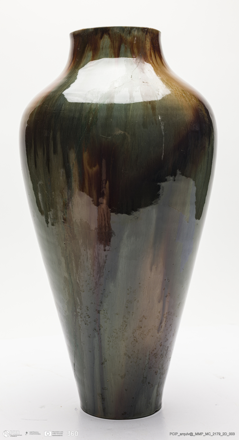 Matéria/Técnica: Barro moldado. Vidrado polícromo: vários tons de verde , castanho; Cronologia: 1885-1905; Autoria: Manuel Gustavo Bordalo Pinheiro / Fábrica Bordalo Pinheiro, Caldas da Rainha, Portugal; Dimensões (cm): Altura: 34; Diâmetro: 19.