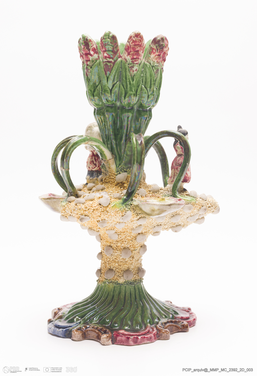 Matéria/Técnica: Faiança. Areado . forma de decoração feita com Barro cozido, triturado e colado à superfície da peça com Barro liquido. Vidrado polícromo: vermelho, amarelo e verde; Cronologia: 1884-1939; Autoria: Herculano Elias / Oficina de Herculano Elias, Caldas da Rainha, Portugal; Dimensões (cm): Altura: 21; Largura: 13; Comprimento: 13.