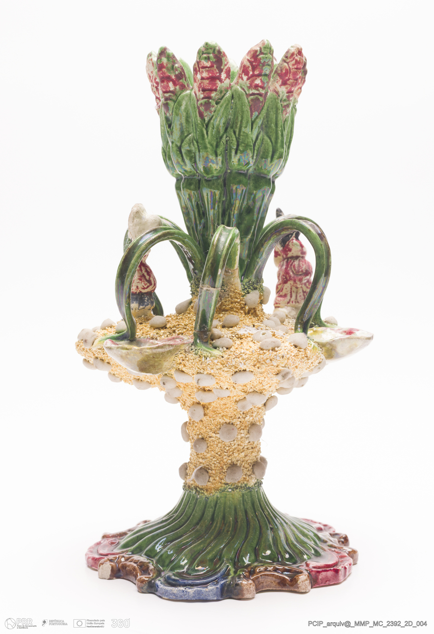 Matéria/Técnica: Faiança. Areado . forma de decoração feita com Barro cozido, triturado e colado à superfície da peça com Barro liquido. Vidrado polícromo: vermelho, amarelo e verde; Cronologia: 1884-1939; Autoria: Herculano Elias / Oficina de Herculano Elias, Caldas da Rainha, Portugal; Dimensões (cm): Altura: 21; Largura: 13; Comprimento: 13.