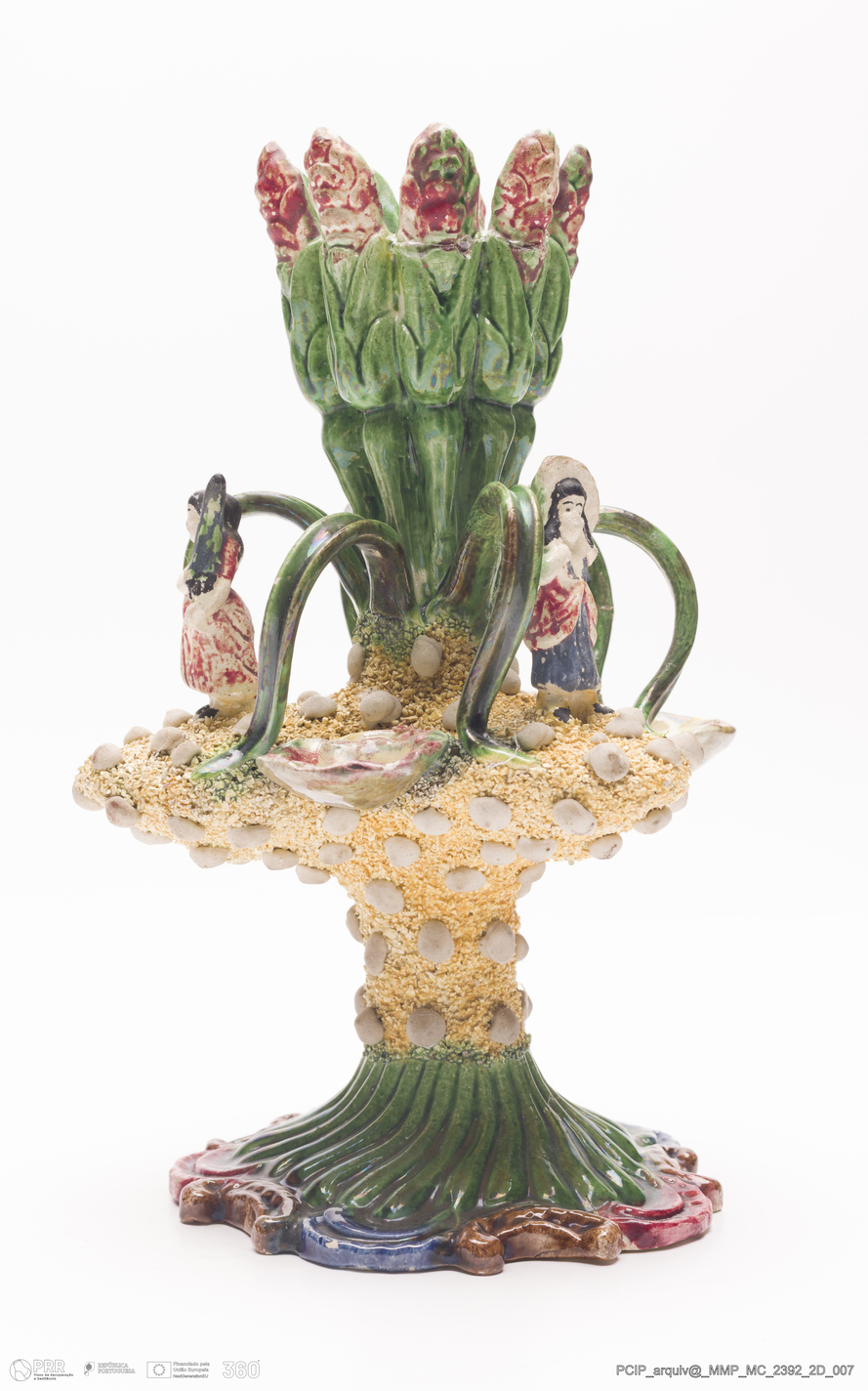 Matéria/Técnica: Faiança. Areado . forma de decoração feita com Barro cozido, triturado e colado à superfície da peça com Barro liquido. Vidrado polícromo: vermelho, amarelo e verde; Cronologia: 1884-1939; Autoria: Herculano Elias / Oficina de Herculano Elias, Caldas da Rainha, Portugal; Dimensões (cm): Altura: 21; Largura: 13; Comprimento: 13.