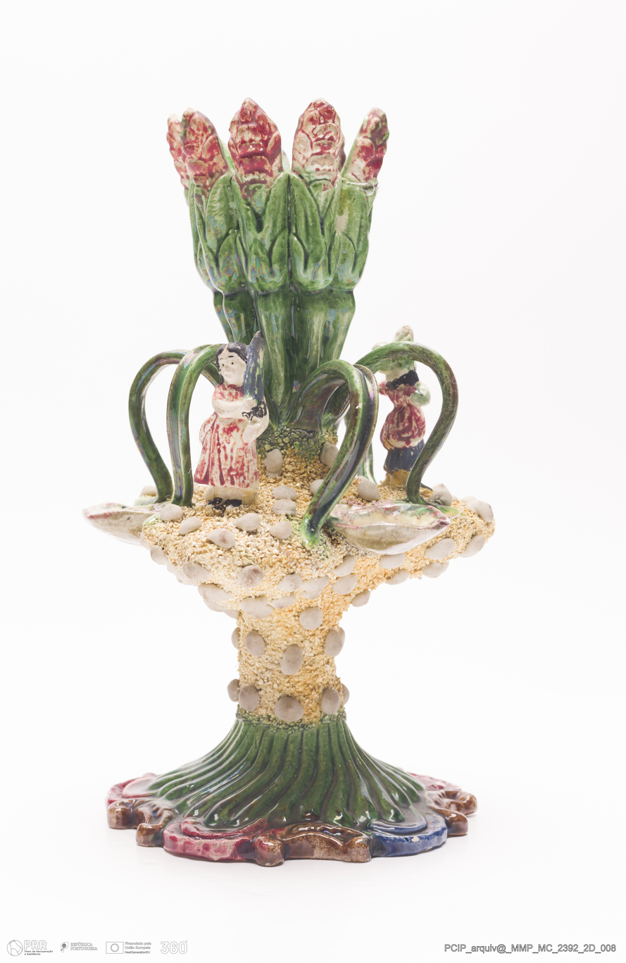 Matéria/Técnica: Faiança. Areado . forma de decoração feita com Barro cozido, triturado e colado à superfície da peça com Barro liquido. Vidrado polícromo: vermelho, amarelo e verde; Cronologia: 1884-1939; Autoria: Herculano Elias / Oficina de Herculano Elias, Caldas da Rainha, Portugal; Dimensões (cm): Altura: 21; Largura: 13; Comprimento: 13.