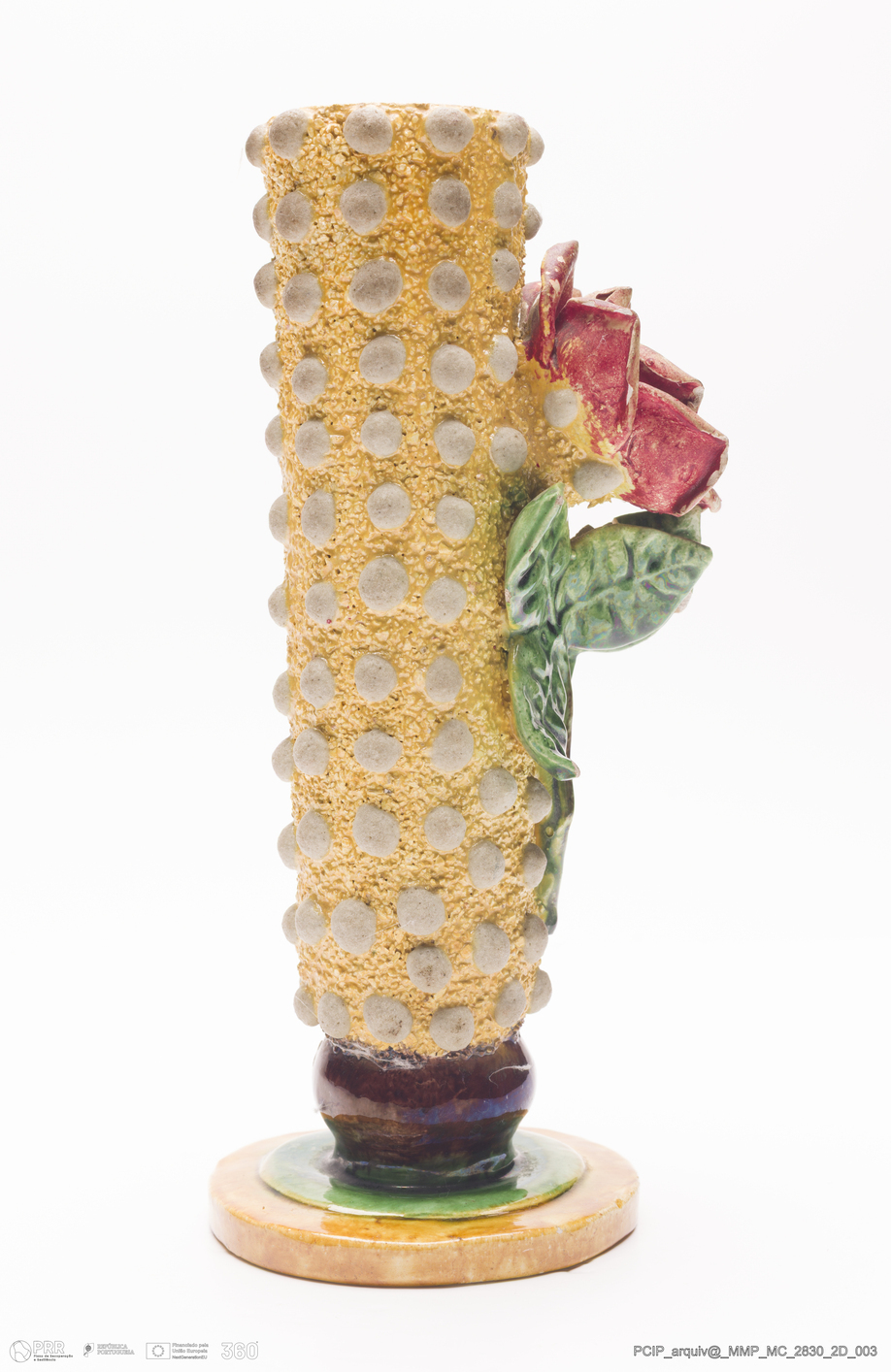 Matéria/Técnica: Faiança. Areado . forma de decoração feita com Barro cozido, triturado e colado à superfície da peça com Barro liquido. Vidrado polícromo: amarelo, verde, vermelho; Cronologia: século XIX; Autoria: Herculano Elias / Oficina de Herculano Elias, Caldas da Rainha, Portugal; Dimensões (cm): Altura: 22,2; Largura: 8,9; Comprimento: 9,8.