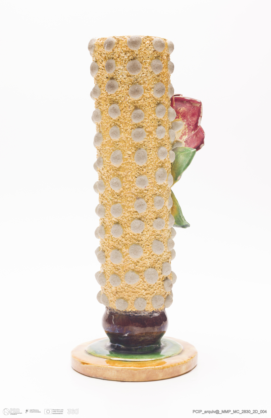 Matéria/Técnica: Faiança. Areado . forma de decoração feita com Barro cozido, triturado e colado à superfície da peça com Barro liquido. Vidrado polícromo: amarelo, verde, vermelho; Cronologia: século XIX; Autoria: Herculano Elias / Oficina de Herculano Elias, Caldas da Rainha, Portugal; Dimensões (cm): Altura: 22,2; Largura: 8,9; Comprimento: 9,8.