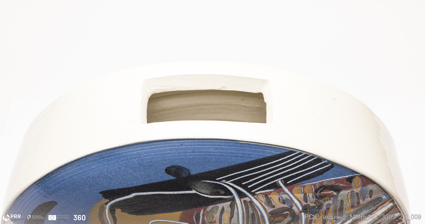 Matéria/Técnica: Grés modelado. Vidrado polícromo: branco, vários tons de azul, preto, amarelo mel e branco; Cronologia: século XX; Autoria: Eduardo Constantino / Atelier de Ceramique de Eduardo Constantino, Quimperlé/Bretanha, França; Dimensões (cm): Altura: 23.