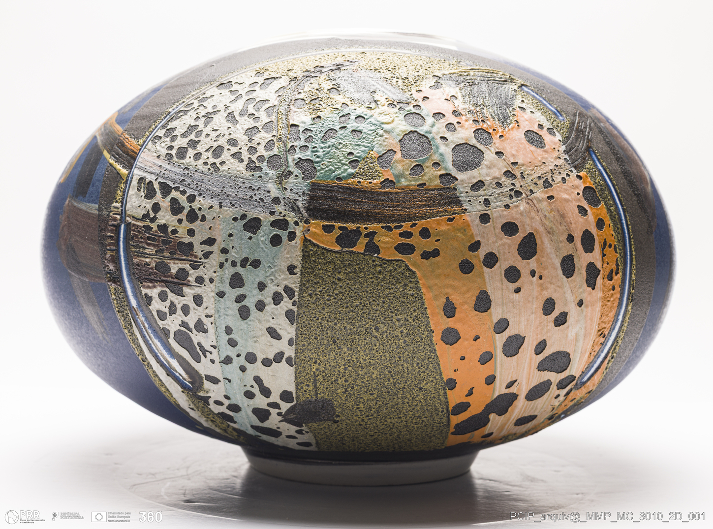 Matéria/Técnica: Grés rodado e moldado. Vidrado polícromo: vários tons de azul, laranja, amarelo, preto e branco; Cronologia: 1997; Autoria: Eduardo Constantino / Atelier de Ceramique de Eduardo Constantino, Quimperlé/Bretanha, França; Dimensões (cm): Altura: 22,5; Largura: 33.