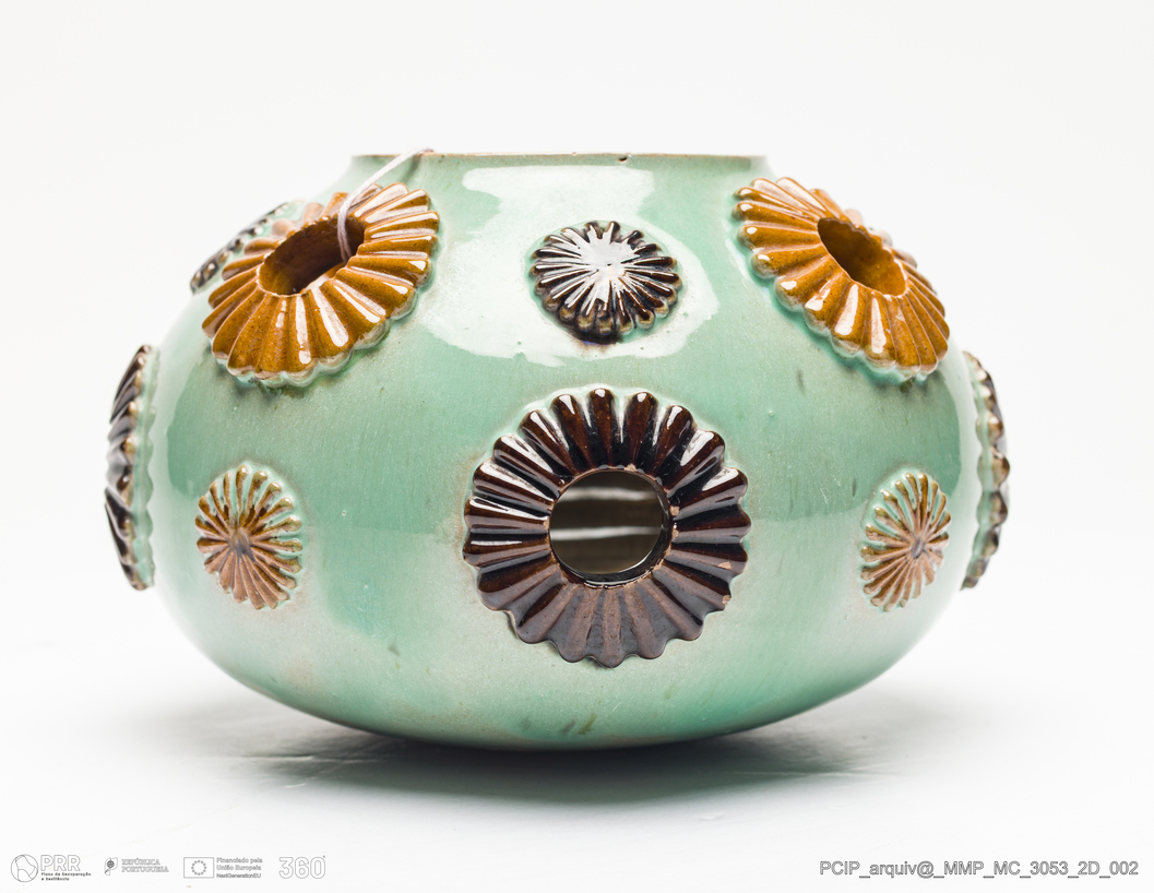 Matéria/Técnica: Barro moldado e modelado. Vidrado polícromo: verde, amarelo e castanho; Cronologia: 1884-1905; Autoria: Rafael Bordalo Pinheiro / Fábrica de Faianças Bordalo Pinheiro, Caldas da Rainha, Portugal; Dimensões (cm): Altura: 12.