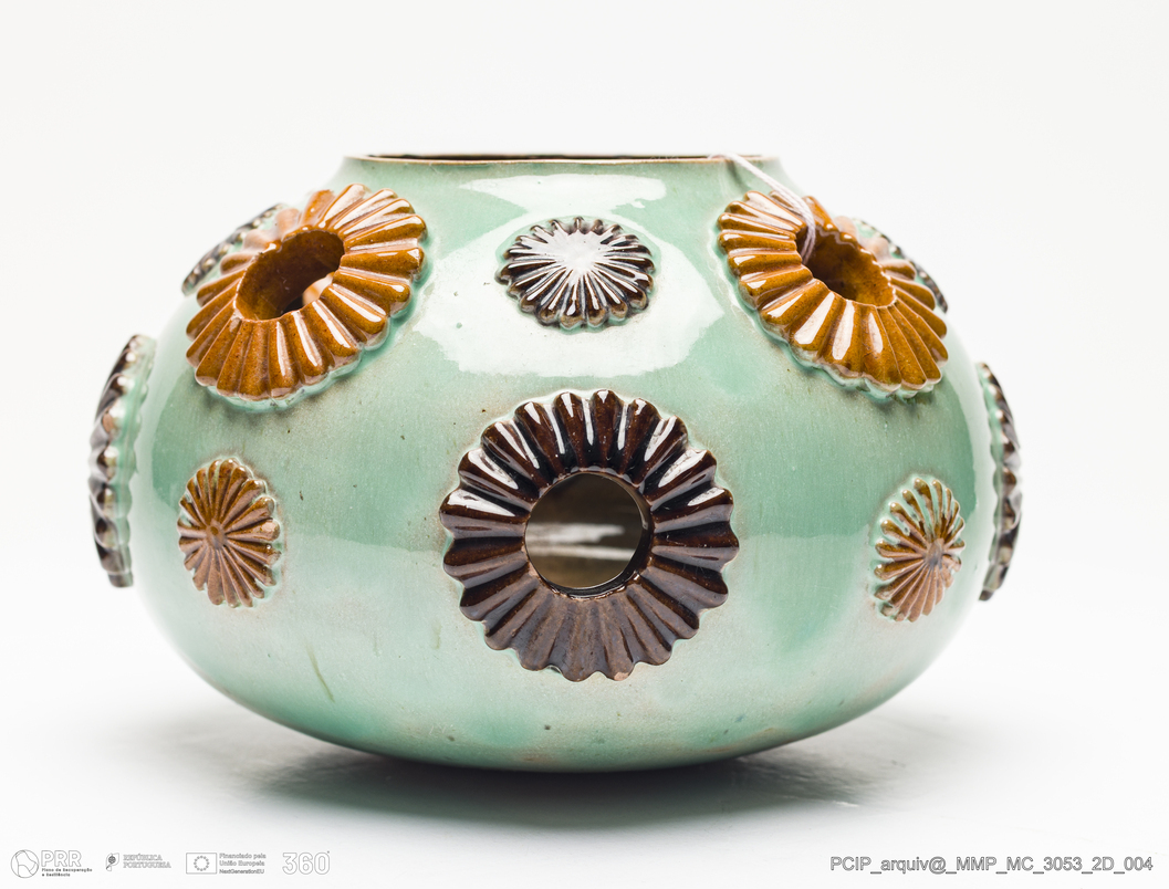 Matéria/Técnica: Barro moldado e modelado. Vidrado polícromo: verde, amarelo e castanho; Cronologia: 1884-1905; Autoria: Rafael Bordalo Pinheiro / Fábrica de Faianças Bordalo Pinheiro, Caldas da Rainha, Portugal; Dimensões (cm): Altura: 12.