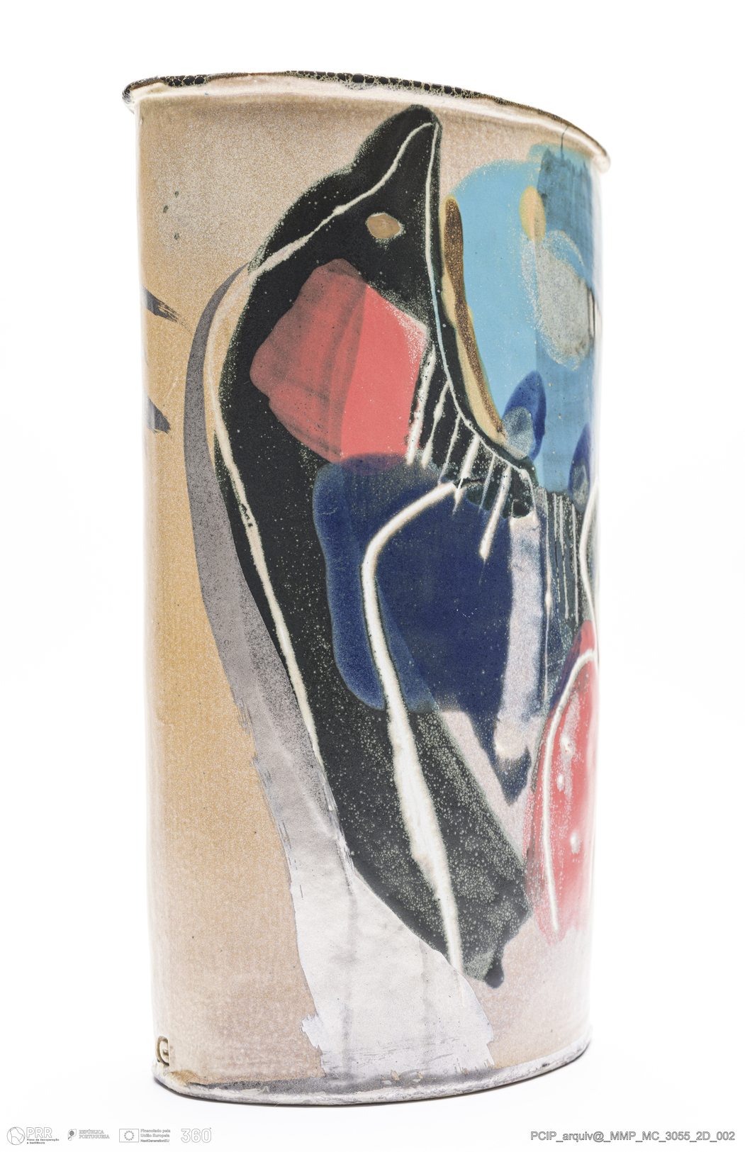 Matéria/Técnica: Grés moldado. Vidrado polícromo: azul, laranja, amarelo, verde, creme, branco e preto; Cronologia: século XX; Autoria: Eduardo Constantino / Atelier de Ceramique de Eduardo Constantino, Quimperlé/Bretanha, França; Dimensões (cm): Altura: 17.