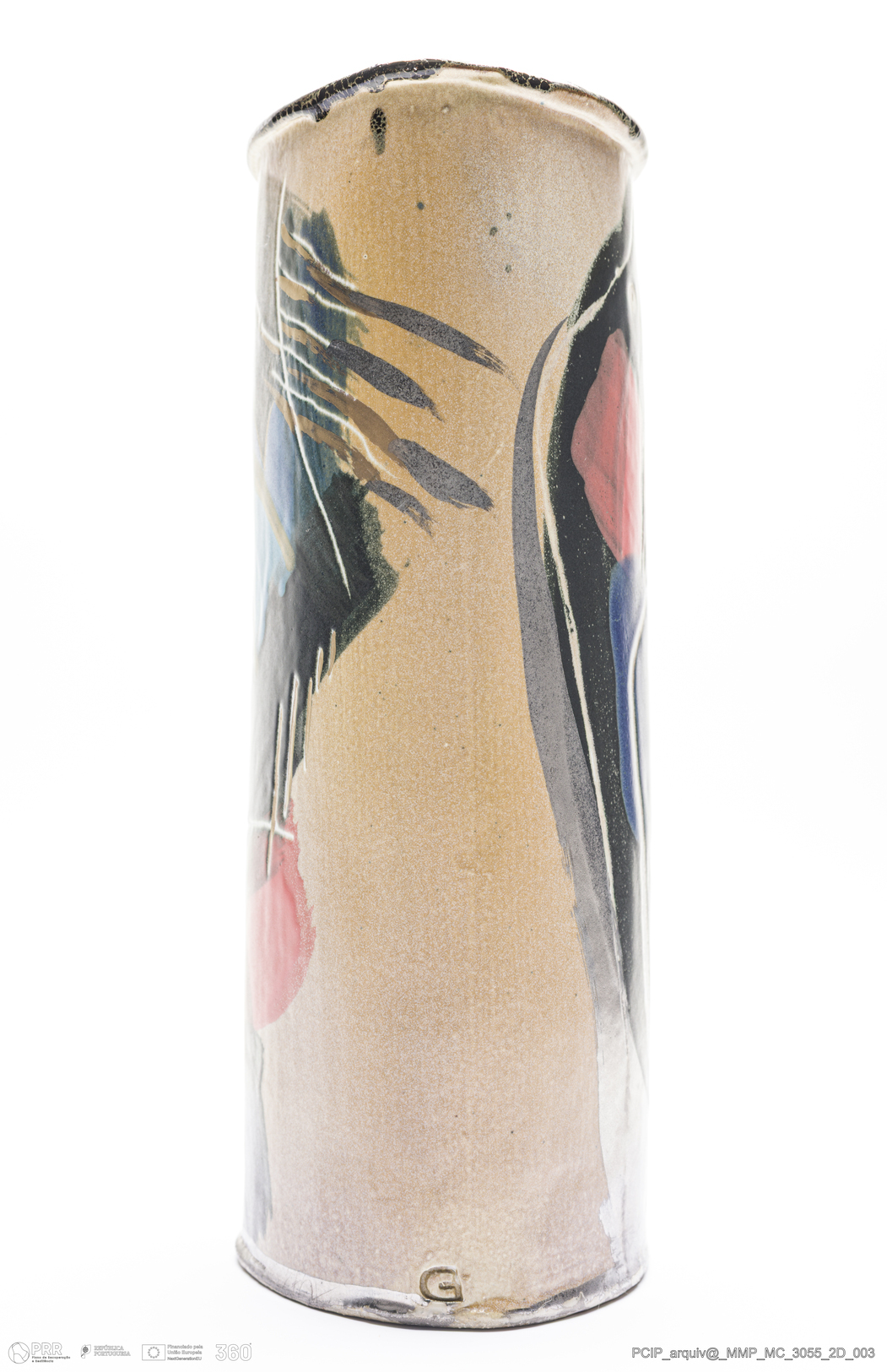 Matéria/Técnica: Grés moldado. Vidrado polícromo: azul, laranja, amarelo, verde, creme, branco e preto; Cronologia: século XX; Autoria: Eduardo Constantino / Atelier de Ceramique de Eduardo Constantino, Quimperlé/Bretanha, França; Dimensões (cm): Altura: 17.