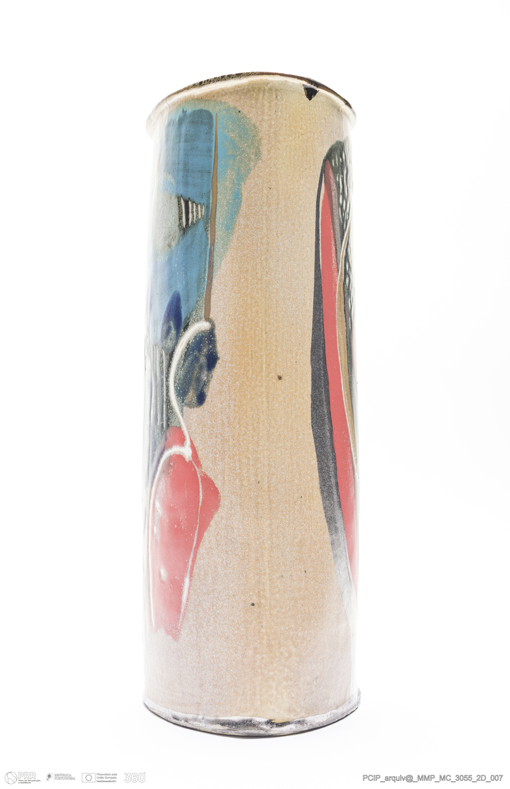 Matéria/Técnica: Grés moldado. Vidrado polícromo: azul, laranja, amarelo, verde, creme, branco e preto; Cronologia: século XX; Autoria: Eduardo Constantino / Atelier de Ceramique de Eduardo Constantino, Quimperlé/Bretanha, França; Dimensões (cm): Altura: 17.