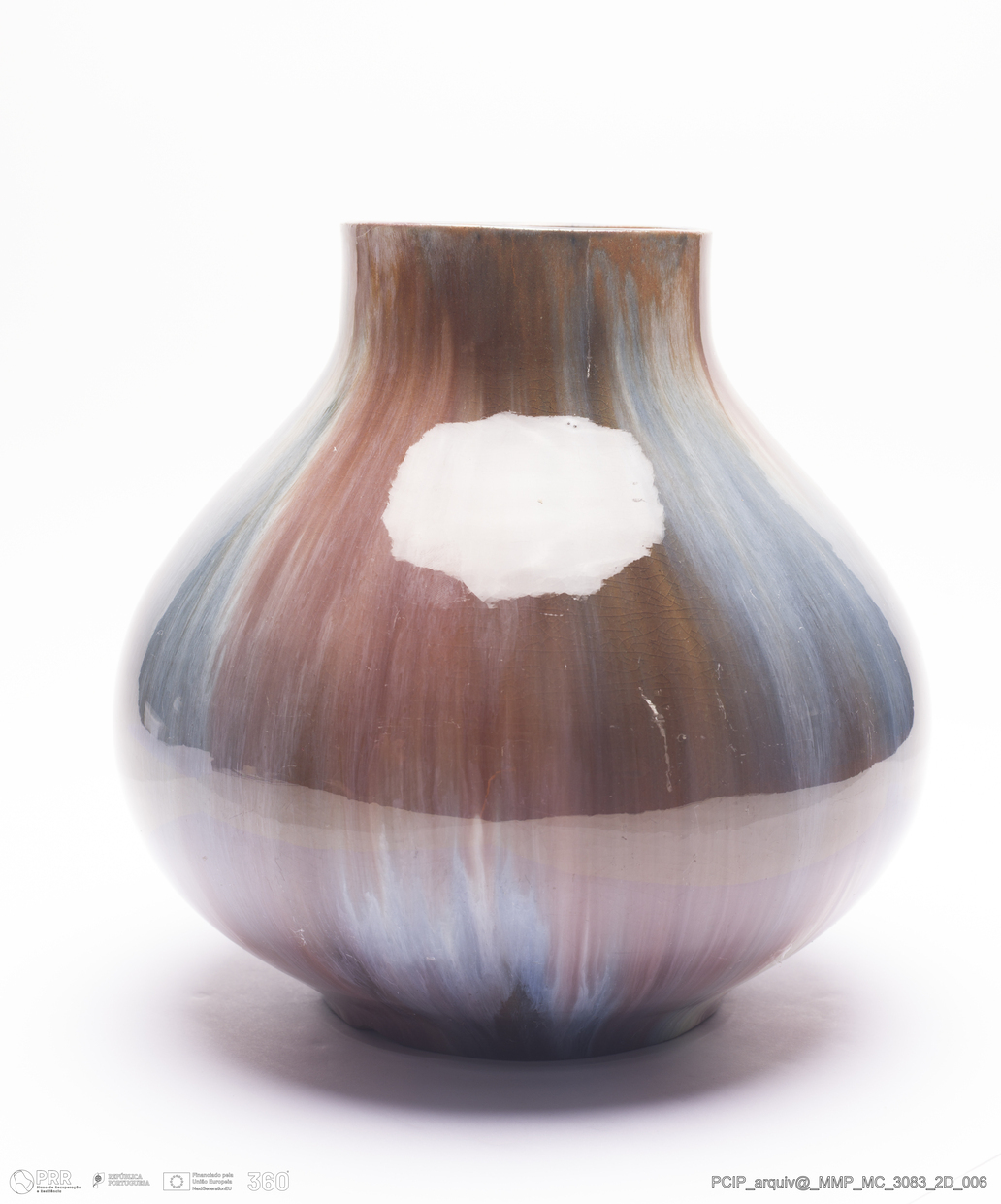 Matéria/Técnica: Barro vermelho rodado e moldado. Vidrado cinzento, azul, branco, castanho e rosa formando escorridos; Cronologia: 1920; Autoria: Manuel Gustavo Bordalo Pinheiro / Fábrica Bordalo Pinheiro, Caldas da Rainha, Portugal; Dimensões (cm): Altura: 18,5; Diâmetro: 20.