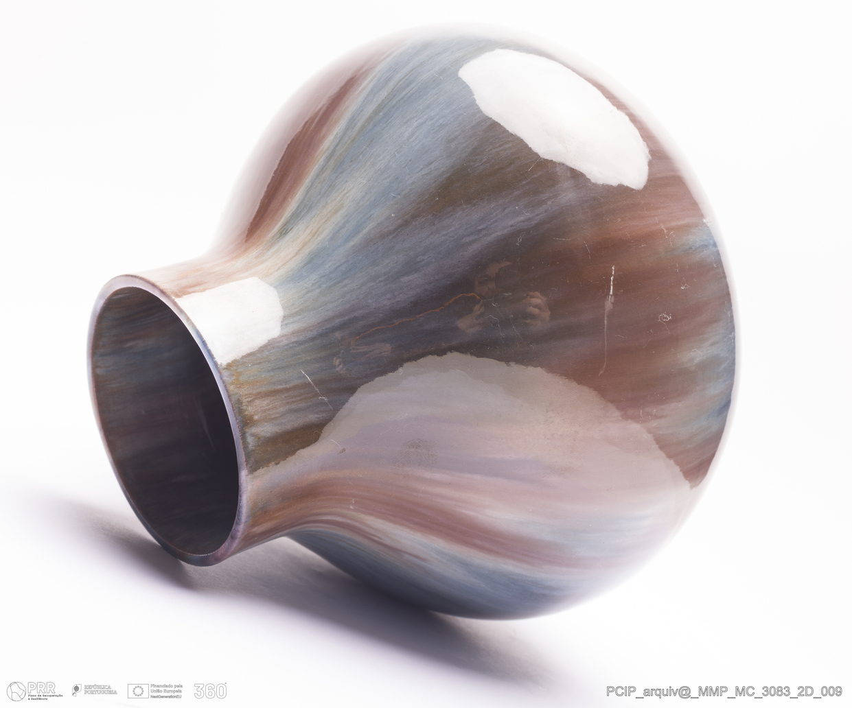 Matéria/Técnica: Barro vermelho rodado e moldado. Vidrado cinzento, azul, branco, castanho e rosa formando escorridos; Cronologia: 1920; Autoria: Manuel Gustavo Bordalo Pinheiro / Fábrica Bordalo Pinheiro, Caldas da Rainha, Portugal; Dimensões (cm): Altura: 18,5; Diâmetro: 20.