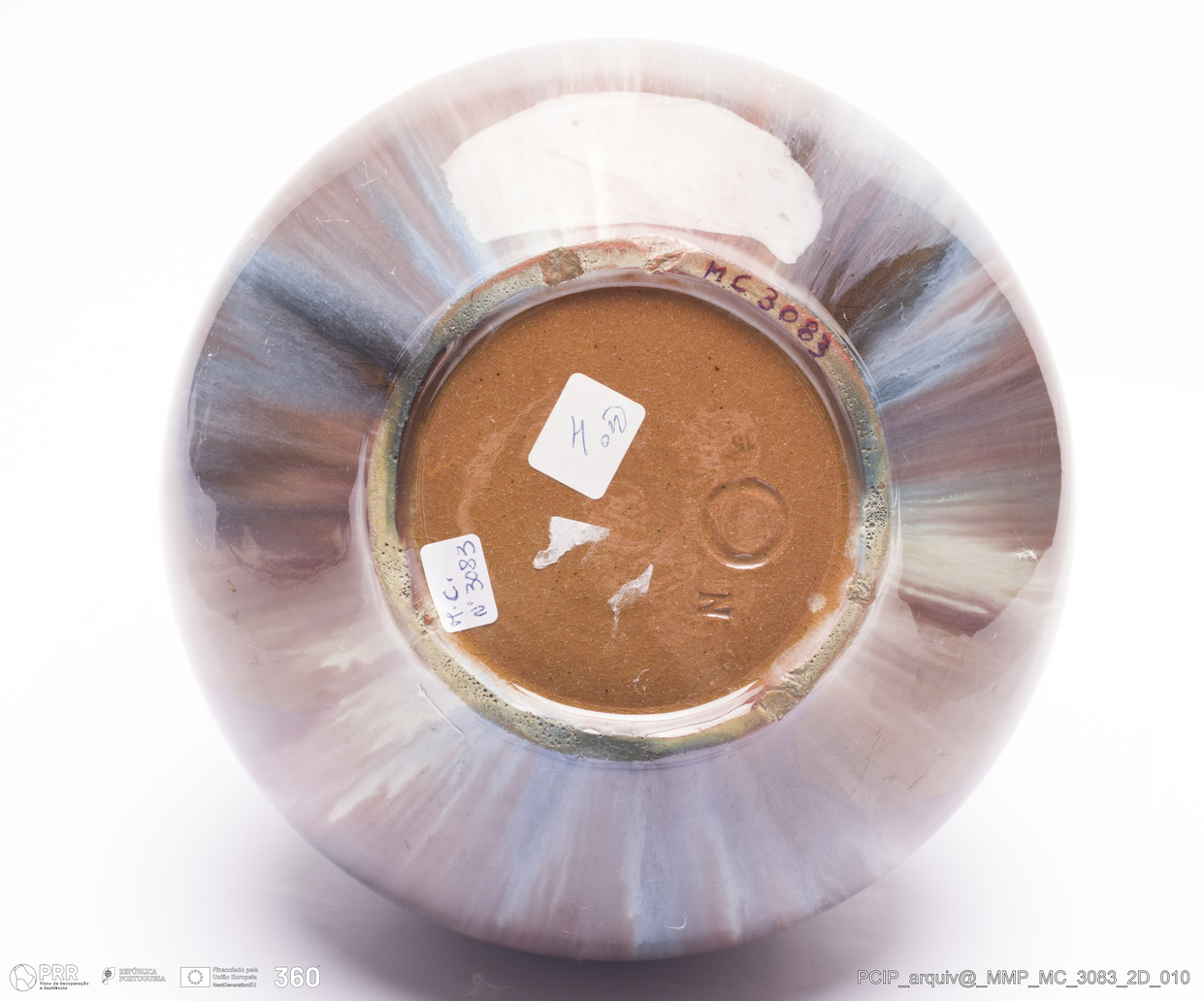 Matéria/Técnica: Barro vermelho rodado e moldado. Vidrado cinzento, azul, branco, castanho e rosa formando escorridos; Cronologia: 1920; Autoria: Manuel Gustavo Bordalo Pinheiro / Fábrica Bordalo Pinheiro, Caldas da Rainha, Portugal; Dimensões (cm): Altura: 18,5; Diâmetro: 20.