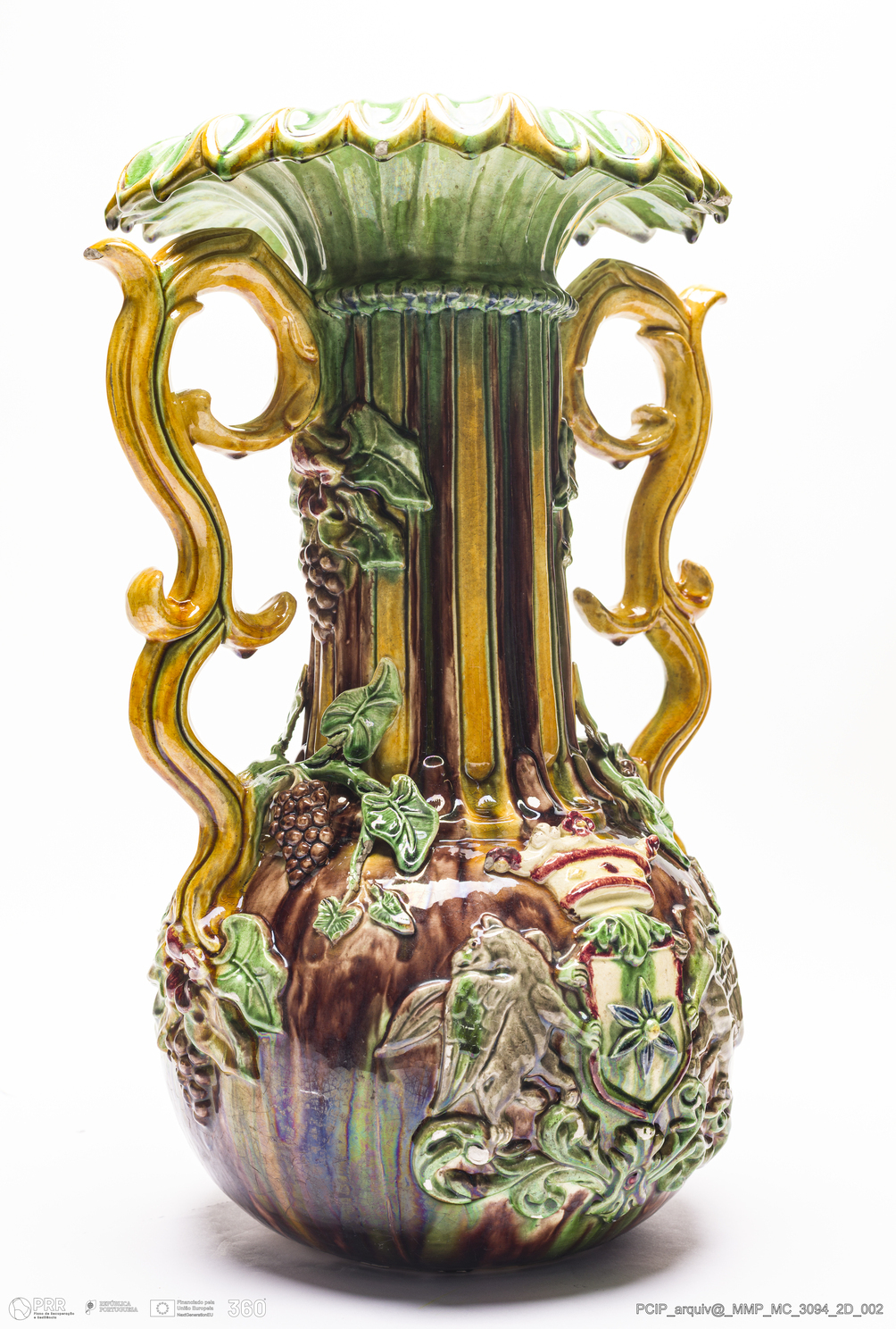 Matéria/Técnica: Barro moldado e modelado. Vidrado polícromo: branco, amarelo, verde, azul, vermelho e cinzento sobre fundo castanho; Cronologia: 1875; Autoria: Desconhecido / Atribuído à Fábrica de Manuel Cipriano Gomes Mafra, Caldas da Rainha, Portugal; Dimensões (cm): Altura: 60; Diâmetro: 40.