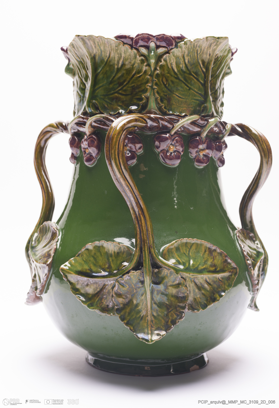 Matéria/Técnica: Barro moldado e modelado. Vidrado polícromo: verde garrafa, verde acastanhado, verde claro, violeta, castanho e amarelo; Cronologia: 1915; Autoria: António Augusto da Costa Motta / Fábrica de Faianças das Caldas da Rainha, Portugal; Dimensões (cm): Altura: 24,8; Diâmetro: 59,5.