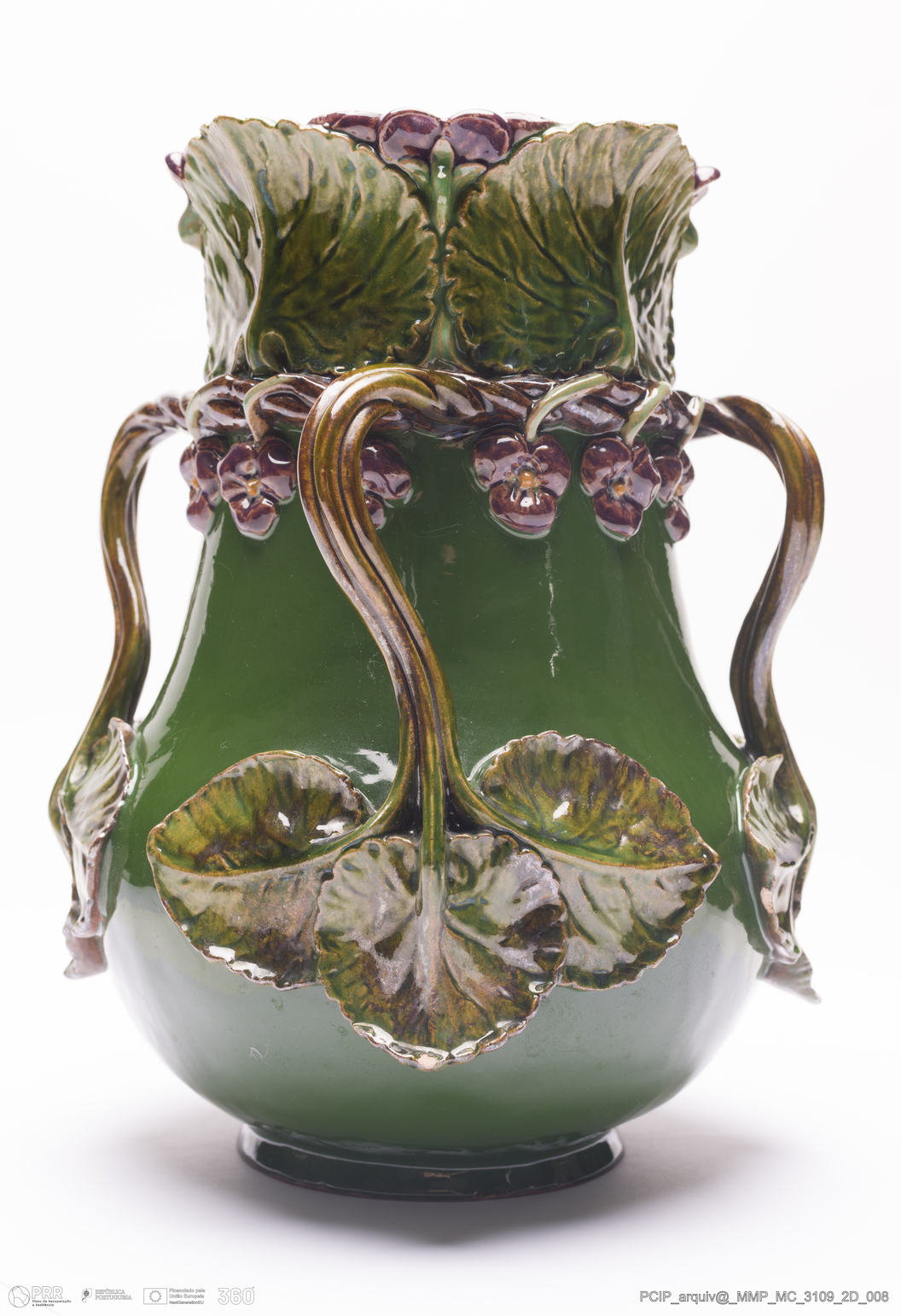 Matéria/Técnica: Barro moldado e modelado. Vidrado polícromo: verde garrafa, verde acastanhado, verde claro, violeta, castanho e amarelo; Cronologia: 1915; Autoria: António Augusto da Costa Motta / Fábrica de Faianças das Caldas da Rainha, Portugal; Dimensões (cm): Altura: 24,8; Diâmetro: 59,5.