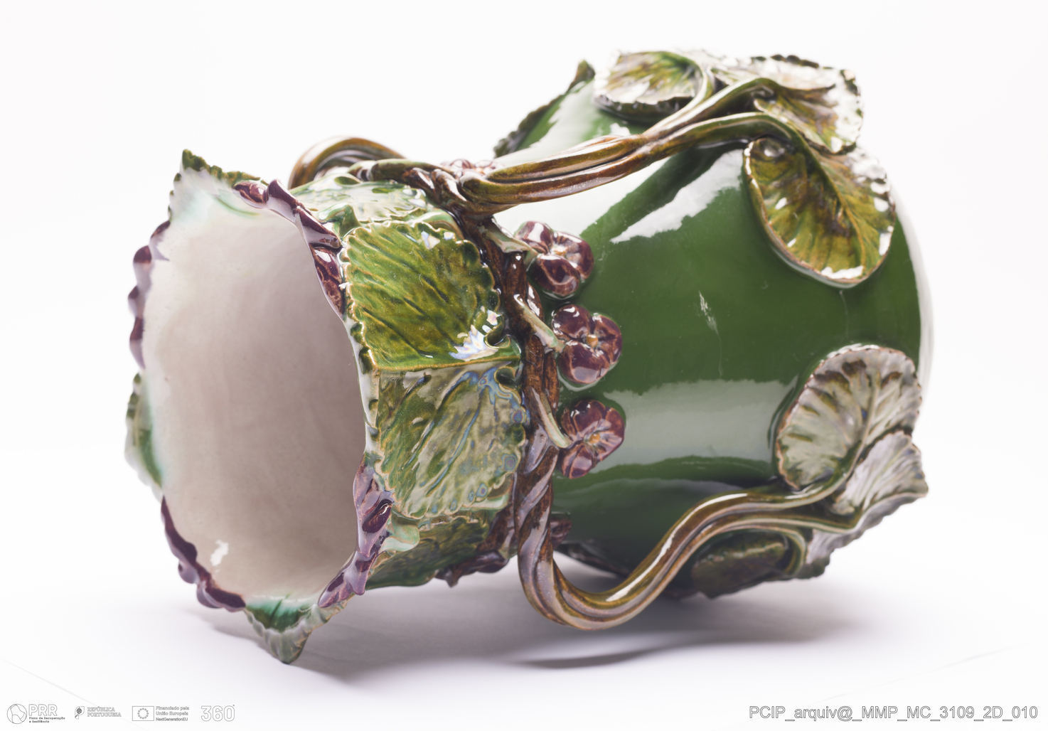 Matéria/Técnica: Barro moldado e modelado. Vidrado polícromo: verde garrafa, verde acastanhado, verde claro, violeta, castanho e amarelo; Cronologia: 1915; Autoria: António Augusto da Costa Motta / Fábrica de Faianças das Caldas da Rainha, Portugal; Dimensões (cm): Altura: 24,8; Diâmetro: 59,5.