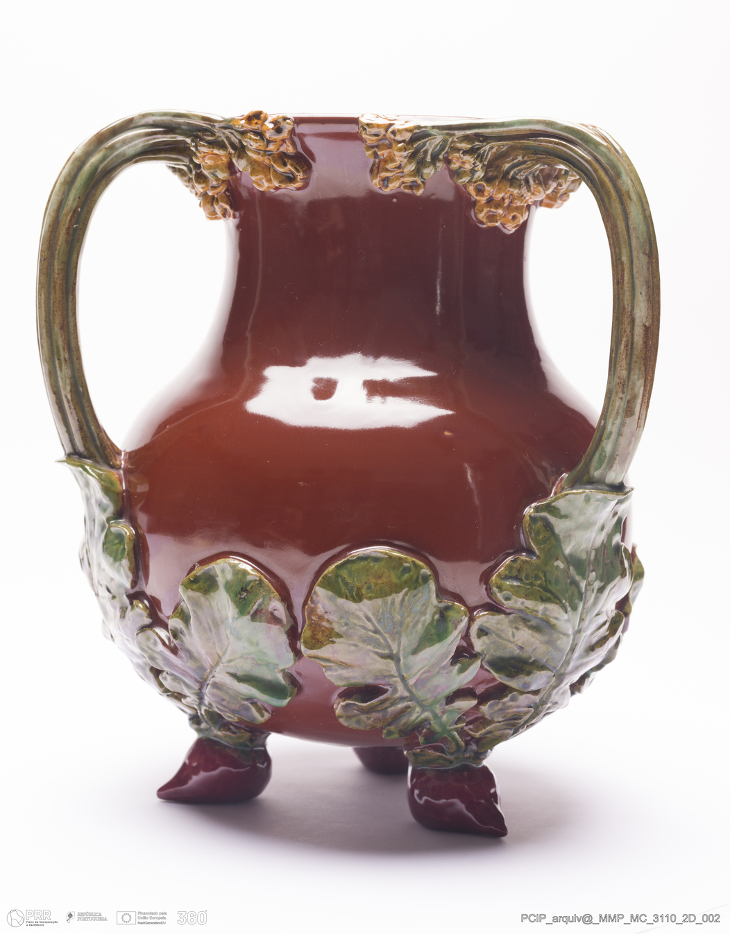 Matéria/Técnica: Barro moldado e modelado. Vidrado polícromo: verde, vermelho e amarelo, fundo castanho avermelhado; Cronologia: 1911; Autoria: António Augusto da Costa Motta / Fábrica de Faianças das Caldas da Rainha, Portugal; Dimensões (cm): Altura: 21,5.