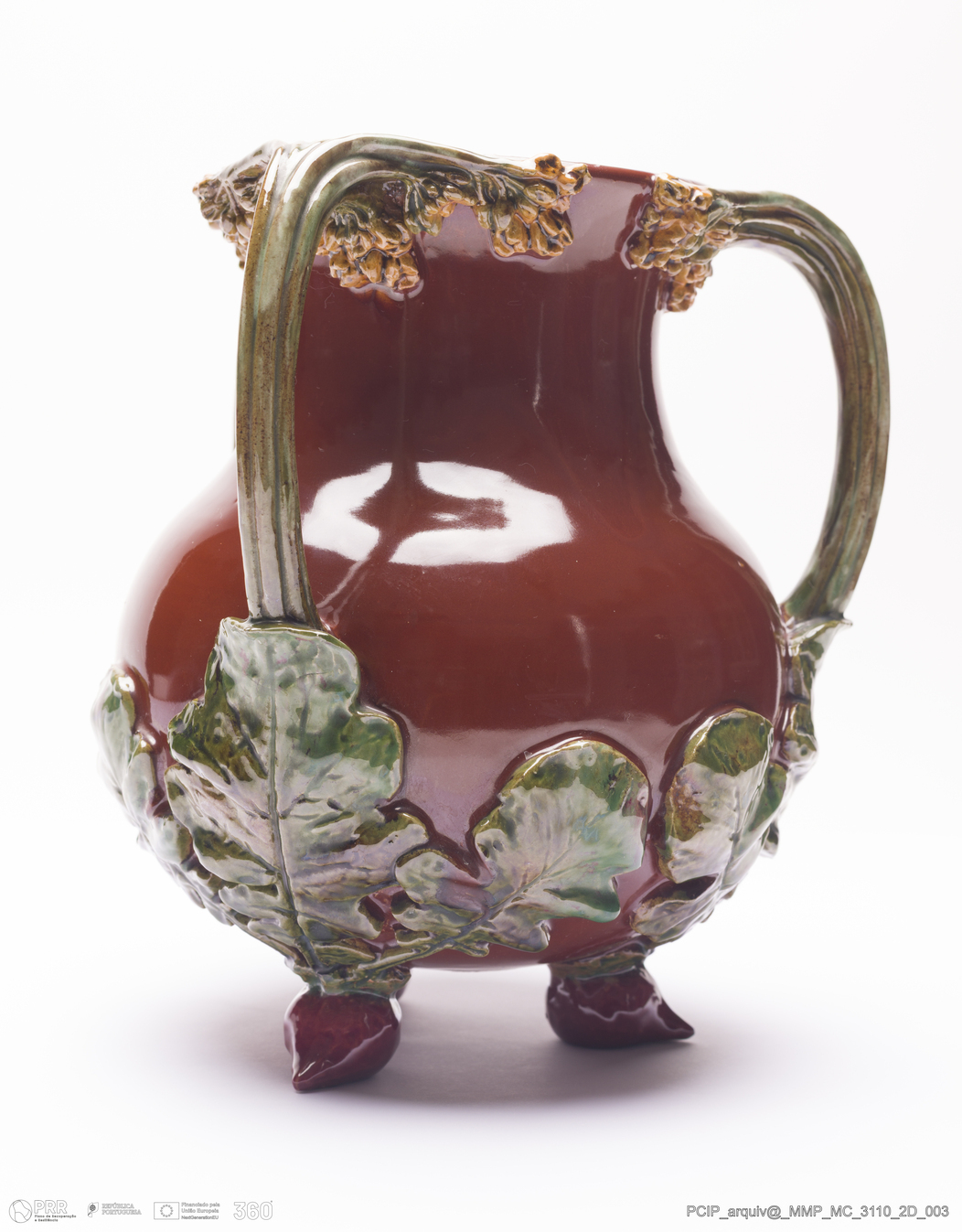 Matéria/Técnica: Barro moldado e modelado. Vidrado polícromo: verde, vermelho e amarelo, fundo castanho avermelhado; Cronologia: 1911; Autoria: António Augusto da Costa Motta / Fábrica de Faianças das Caldas da Rainha, Portugal; Dimensões (cm): Altura: 21,5.