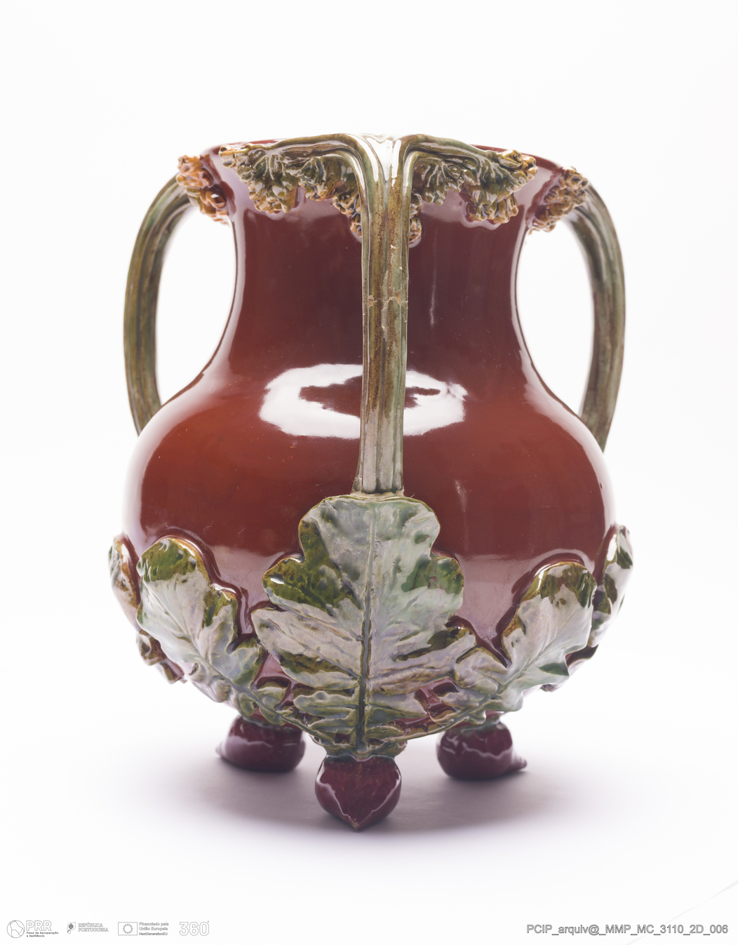 Matéria/Técnica: Barro moldado e modelado. Vidrado polícromo: verde, vermelho e amarelo, fundo castanho avermelhado; Cronologia: 1911; Autoria: António Augusto da Costa Motta / Fábrica de Faianças das Caldas da Rainha, Portugal; Dimensões (cm): Altura: 21,5.