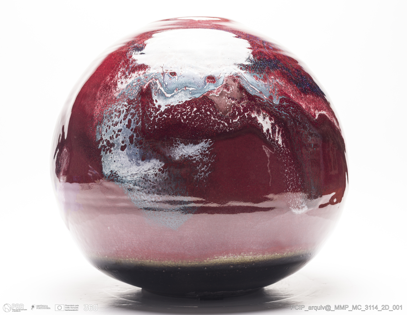 Matéria/Técnica: Grés rodado. Vidrado polícromo: preto, vermelho, cinzento, azul, castanho e branco; Cronologia: 1998-2003; Autoria: Eduardo Constantino / Atelier de Ceramique de Eduardo Constantino, Quimperlé/Bretanha, França; Dimensões (cm): Altura: 31; Diâmetro: 35.