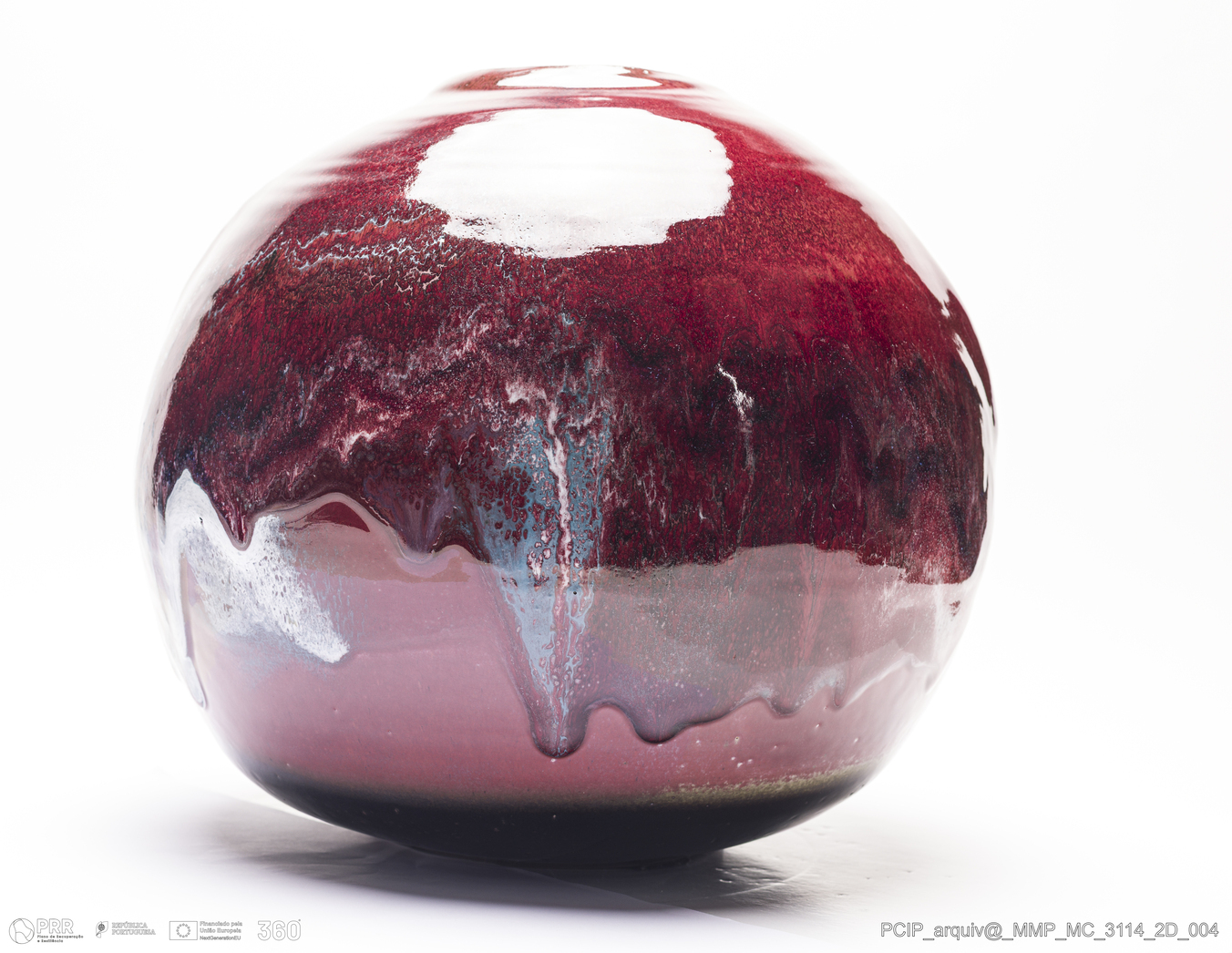 Matéria/Técnica: Grés rodado. Vidrado polícromo: preto, vermelho, cinzento, azul, castanho e branco; Cronologia: 1998-2003; Autoria: Eduardo Constantino / Atelier de Ceramique de Eduardo Constantino, Quimperlé/Bretanha, França; Dimensões (cm): Altura: 31; Diâmetro: 35.