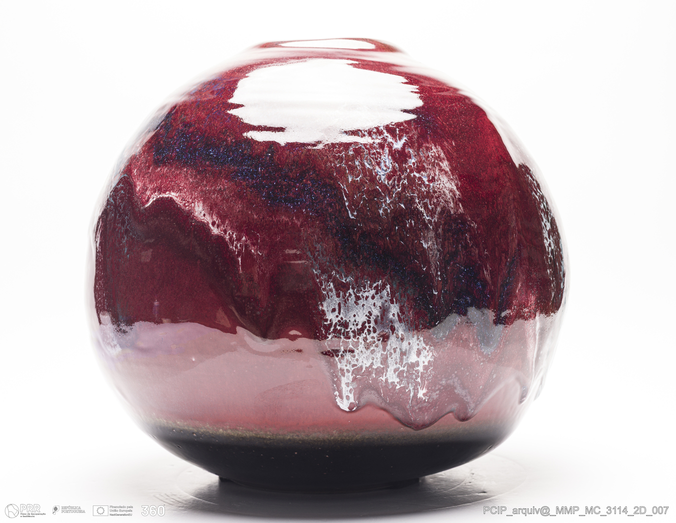 Matéria/Técnica: Grés rodado. Vidrado polícromo: preto, vermelho, cinzento, azul, castanho e branco; Cronologia: 1998-2003; Autoria: Eduardo Constantino / Atelier de Ceramique de Eduardo Constantino, Quimperlé/Bretanha, França; Dimensões (cm): Altura: 31; Diâmetro: 35.