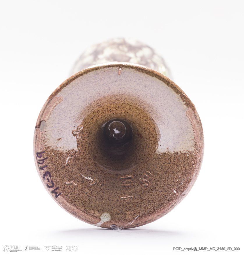Matéria/Técnica: Barro moldado. Vidrado com escorridos; Cronologia: 1904; Autoria: Manuel Gustavo Bordalo Pinheiro / Fábrica de Faianças das Caldas da Rainha, Portugal; Dimensões (cm): Altura: 17,5; Diâmetro: 8,5.