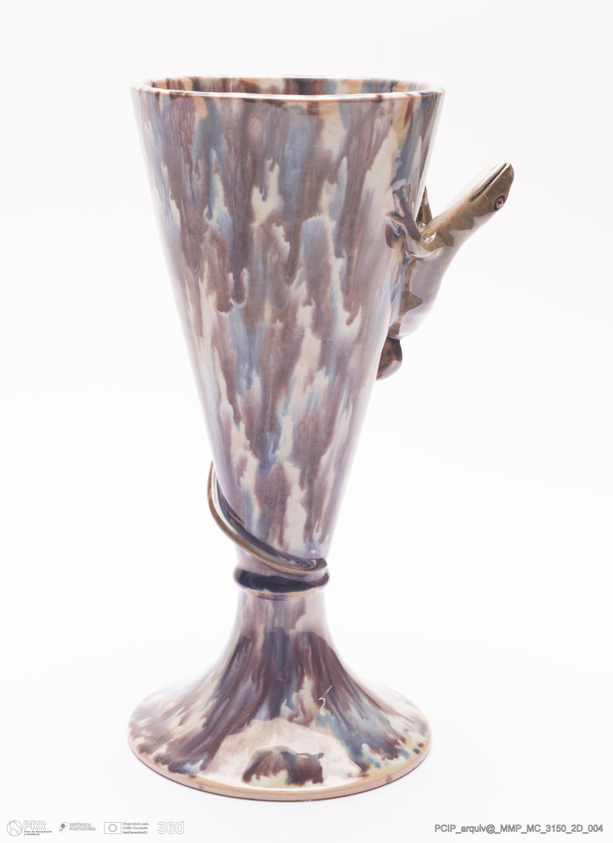 Matéria/Técnica: Barro moldado. Vidrado com escorridos; Cronologia: 1904; Autoria: Manuel Gustavo Bordalo Pinheiro / Fábrica de Faianças das Caldas da Rainha, Portugal; Dimensões (cm): Altura: 18; Diâmetro: 8,5.