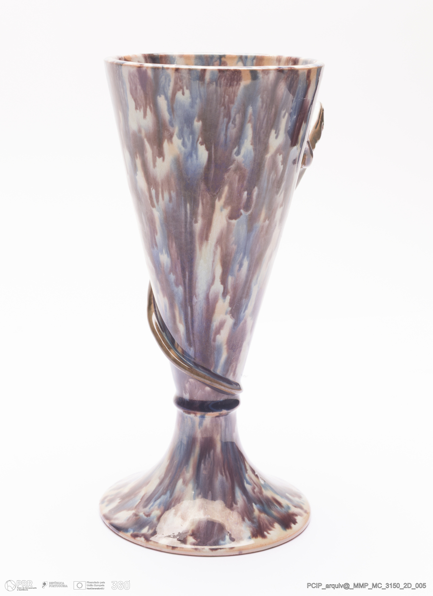 Matéria/Técnica: Barro moldado. Vidrado com escorridos; Cronologia: 1904; Autoria: Manuel Gustavo Bordalo Pinheiro / Fábrica de Faianças das Caldas da Rainha, Portugal; Dimensões (cm): Altura: 18; Diâmetro: 8,5.